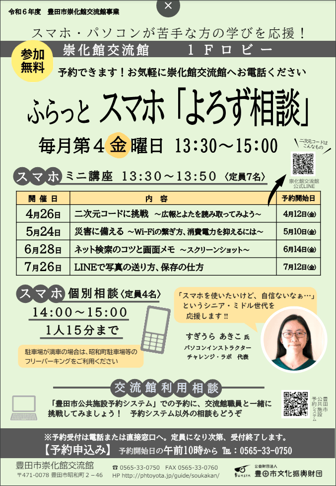 今年度からは、毎月個別相談枠がありますので、ぜひこの機会に、日々のスマホのもやもやを解消してください。